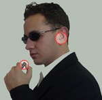 The SPY using a chest mounted interface device which allows the inductive transmission to the SOS wireless earphone and the Microphone functions.